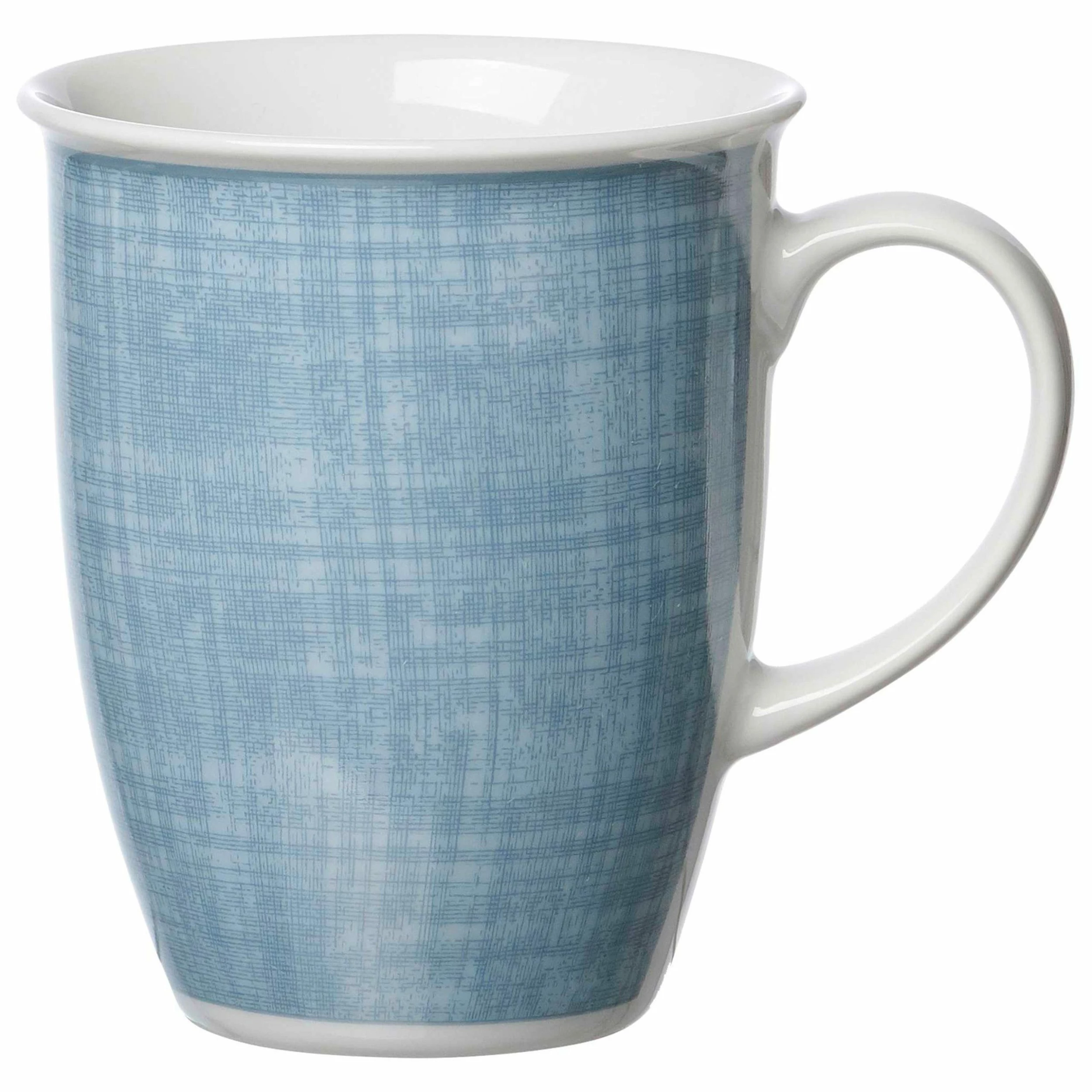 - Auf jedem Becher ist außen ein Gittermuster zu sehen, das kleine Unterbrechungen hat und an die Webstruktur von Stoffen erinnert, während die Innenseite und der Henkel schlicht in Weiß gehalten sind