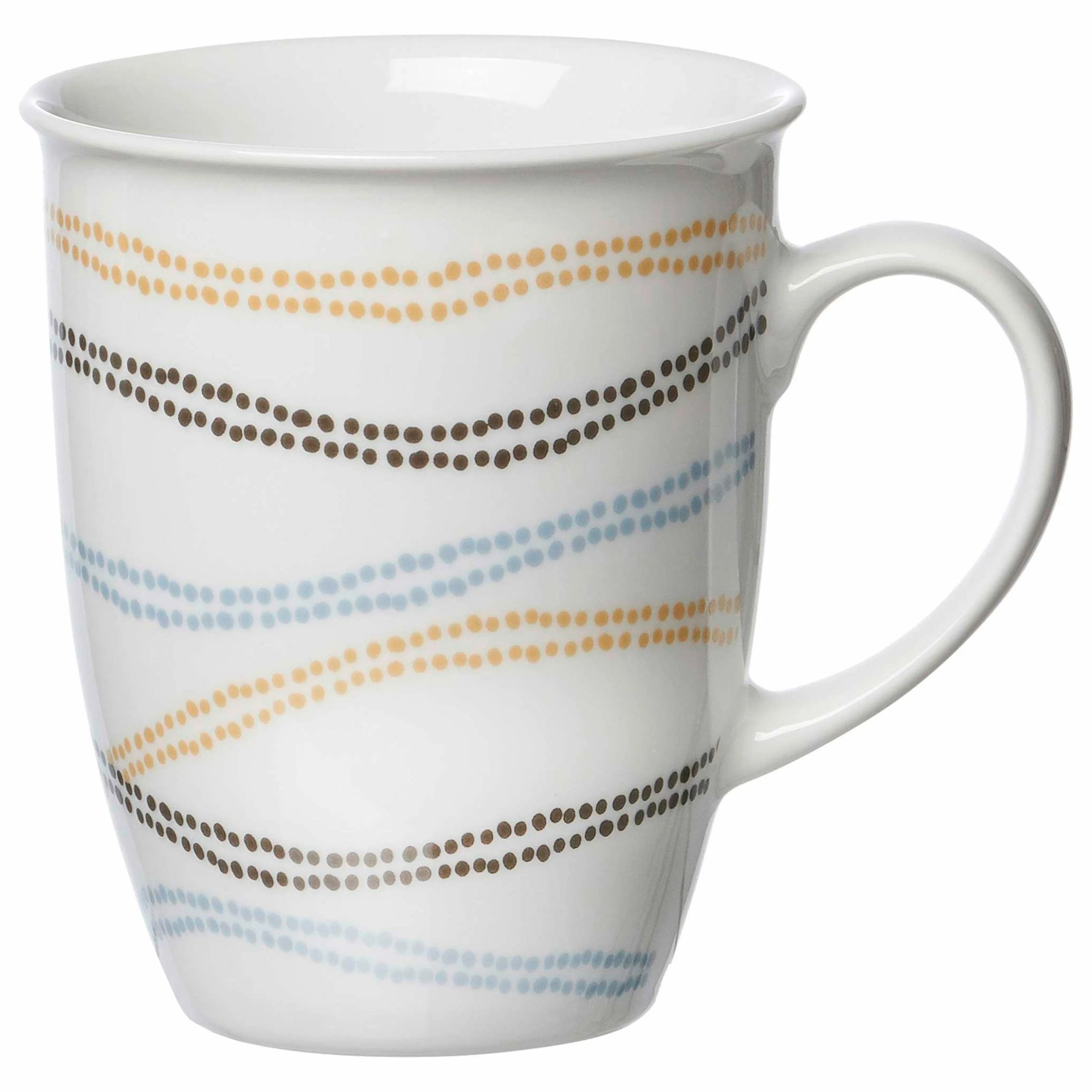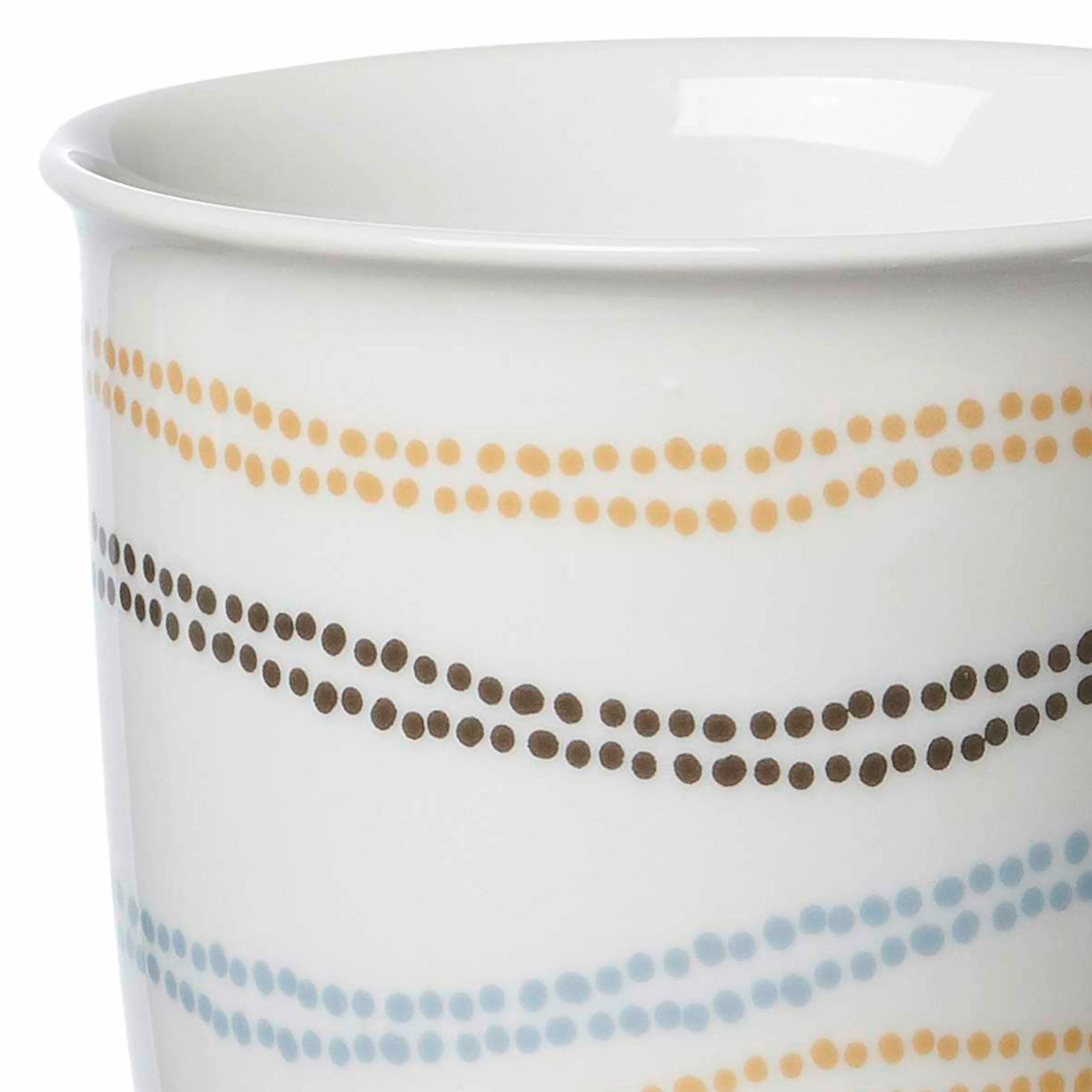 - Auf jedem Becher sind gepunktete Linien in Hellblau, Dunkelbraun & Ocker zu sehen, die ringsum über die Fläche tanzen
