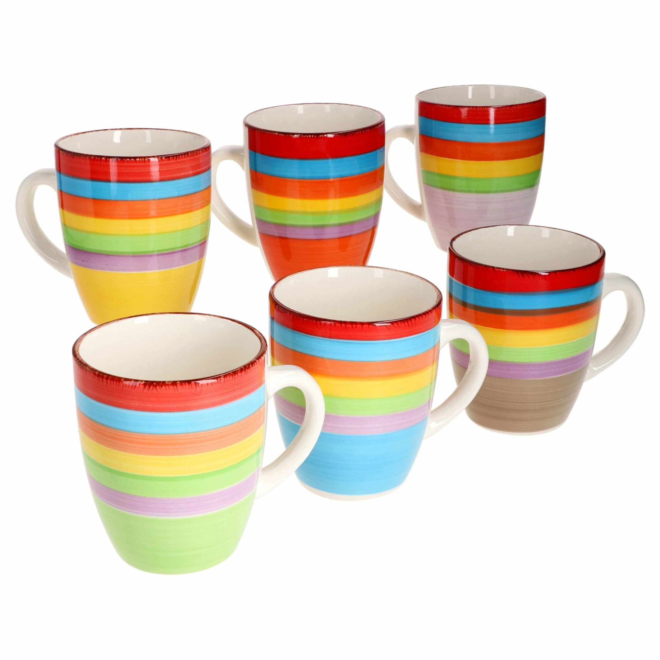 - Je ein roter, blauer, orangefarbener, gelber, grüner und lilafarbener Streifen ziert fast den ganzen Becher und wird durch je eine individuelle Farbe am unteren Rand vervollständigt, während der Henkel schlicht in Creme gehalten ist
