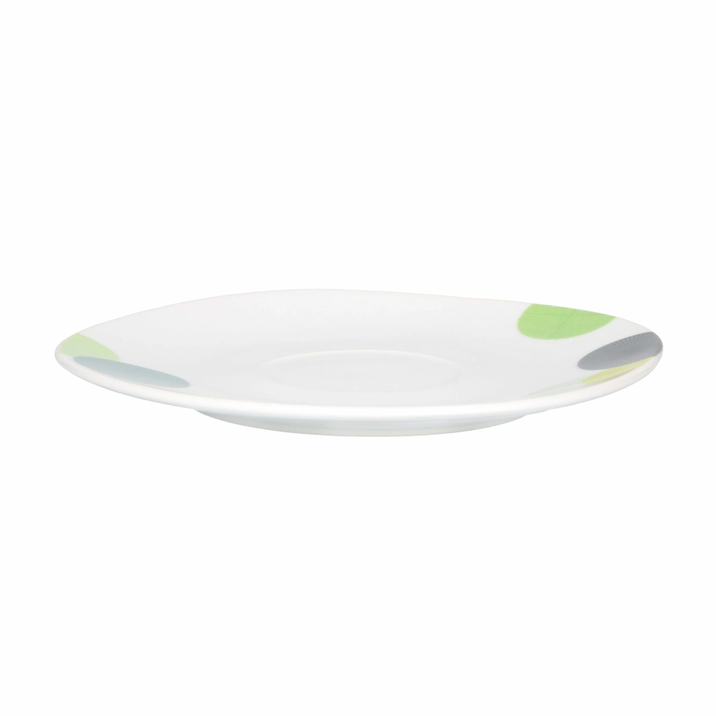 Der Unterteller misst 12 x 12 cm und ist 1.5 cm hoch. Der umlaufende Tellerrand (4 cm breit) wölbt sich an den Seitenkanten leicht auf und erlaubt so ein sicheres Tragen und Halten der kleinen Tasse. Sämtliche Kanten sind gerundet und gehen weich ineinander über.