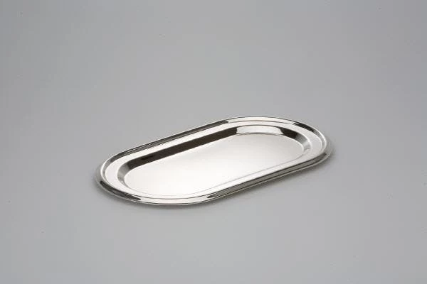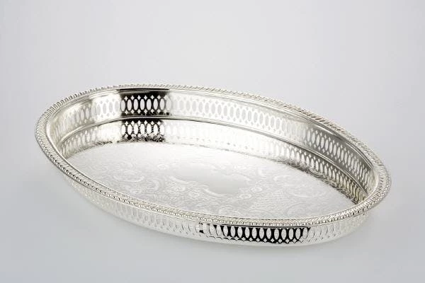 Ovales Galerie- Tablett, glatt poliert, versilbert und anlaufgeschützt. Das Tablett hat eine Maße von 37 x 26 x 3,5 cm.