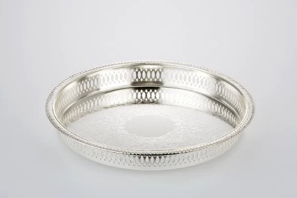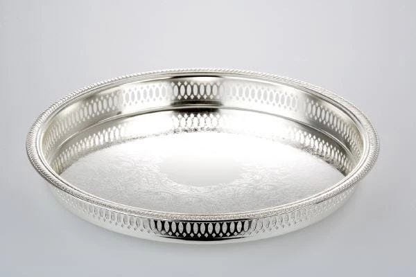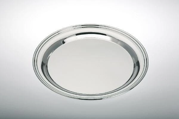 Tablett rund, versilbert und anlaufgeschützt. Der Außendurchmesser des Tabletts ist 28 cm.