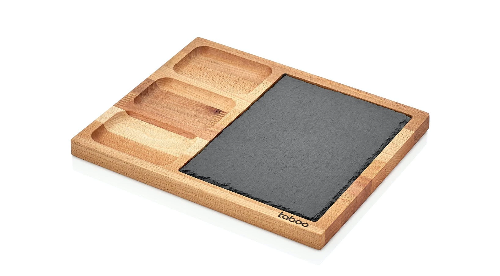 Die tolle und nachhaltige Kombination aus Bambus und Schiefer vereint Umweltbewusstsein mit edlem Design. Die Schieferplatte ist herausnehmbar und kann auch einzeln als Platzset oder Teller genutzt werden.