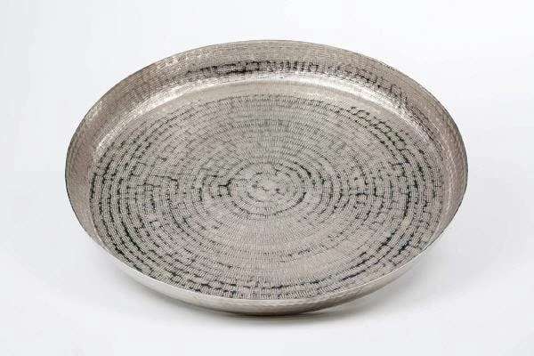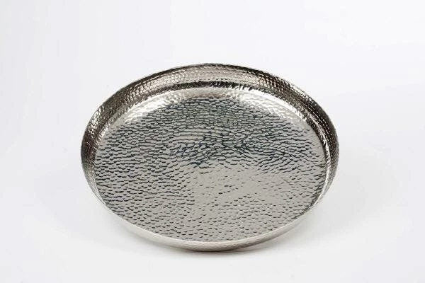 Tablett aus Aluminium vernickelt. Die Außengröße ist 20 x 20 cm und die Innengröße ist 15 x 15 cm.